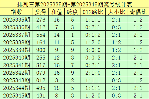 开奖回顾:排列三第2025345期奖号开出:431,组选类型:组六,大小比为0:3,奇偶比为2:1,和值为8,跨度为3。