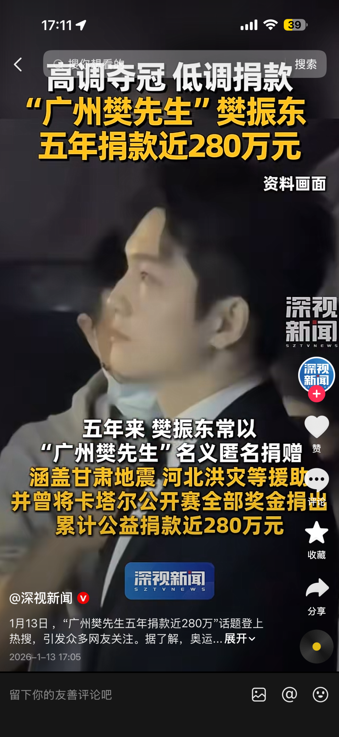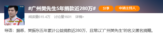 樊振东常以“广州樊先生”的名义匿名捐赠,五年累计公益捐款近280万,涵盖甘肃地震河北洪灾等援助,并曾将卡塔尔公开赛全部奖金捐出。
