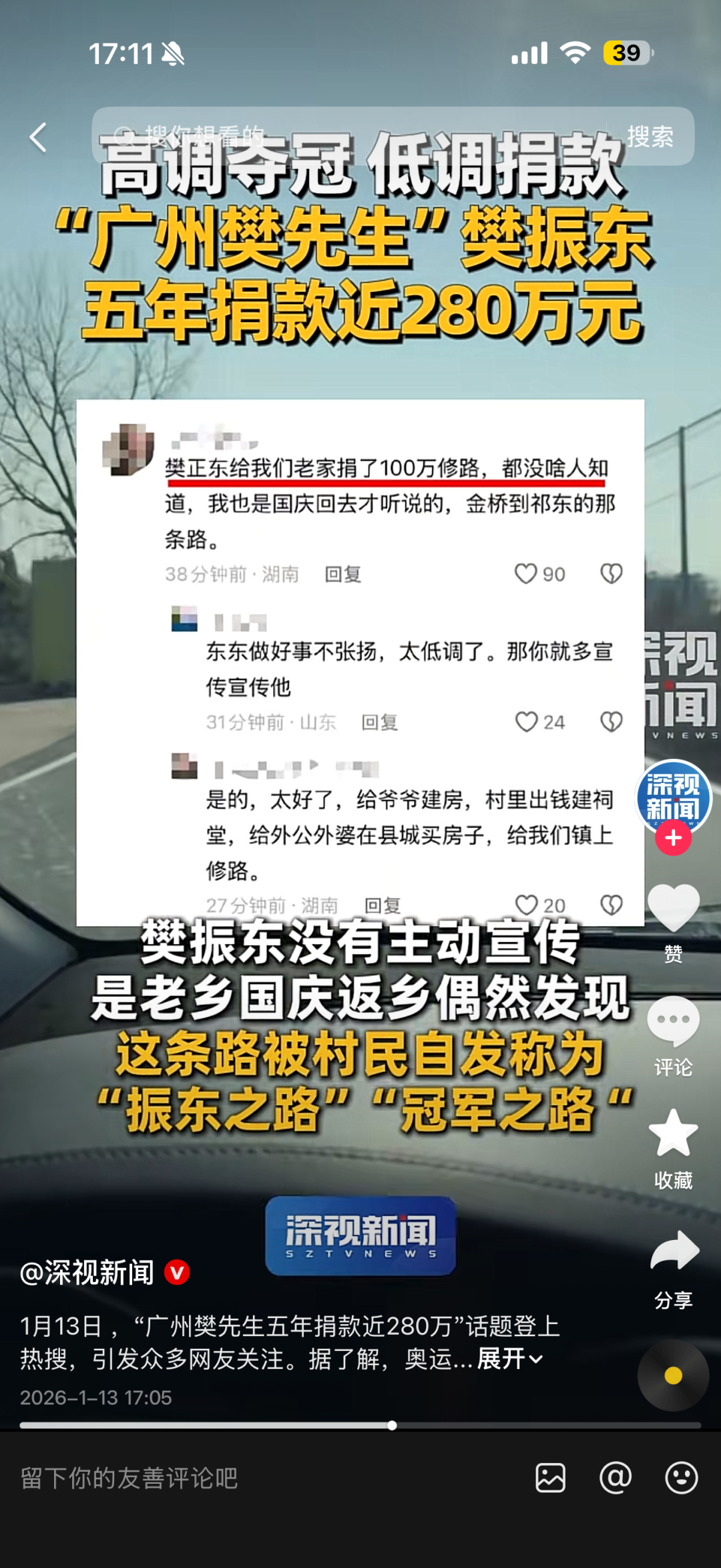2024年德甲赛事20万元奖金全数捐赠;2020年捐出30万元支援武汉抗疫,2023年甘肃地震、河北水灾各捐30万元。五年来,樊振东累计公益捐款近280万元。