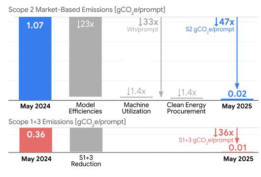 一年间,通过模型优化和额外清洁能源的使用,Gemini的能耗降至原来的1/33,碳排放降至1/44,同时提供了更高质量的响应。
