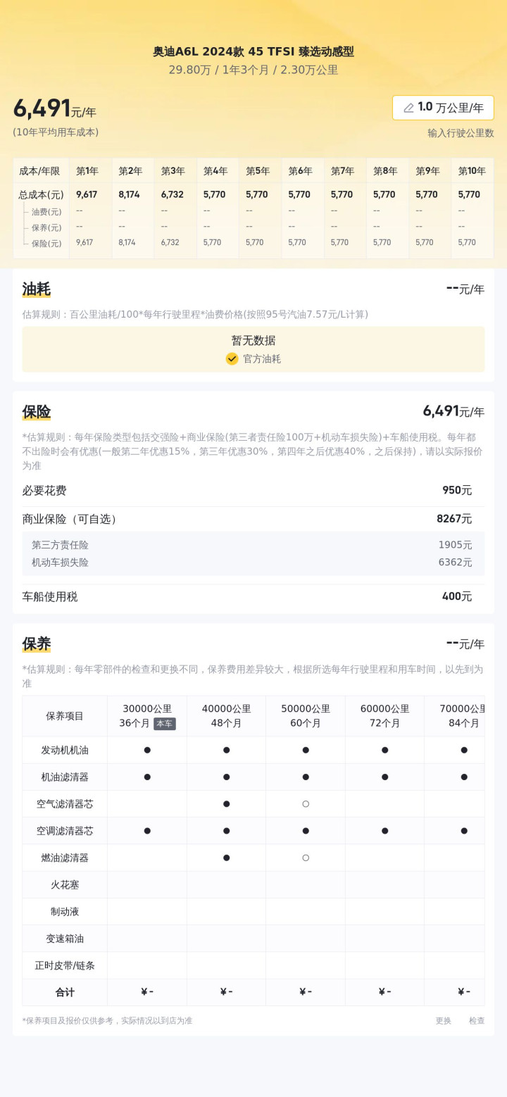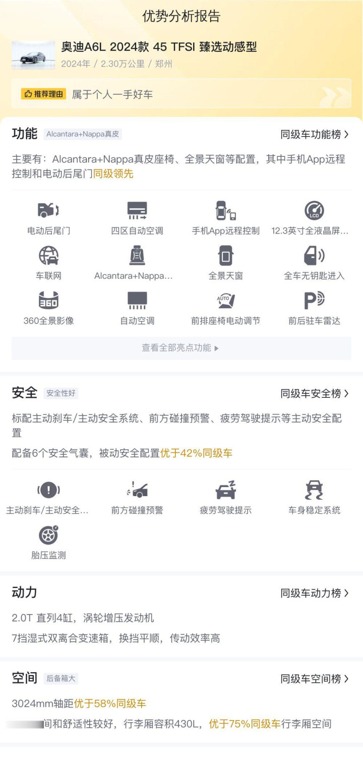 这辆奥迪A6L 2024款 45 TFSI 臻选动感型上牌时间为2024年7月,上牌地车源地均为郑州,行驶里程2.3万公里,排放标准为国VI b,新车指导价45.49万,而现在的二手车报价为29.8万,车身颜色为黑色,至今无过户记录。